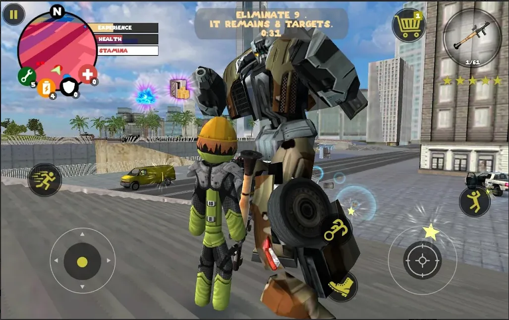 2、元素丰富:游戏汇聚角色扮演、枪战等多种元素,你能化身为火柴人英雄,借助绳索技能飞檐走壁,应对犯罪现场,还有丰富武器装备可选,更能驾驶车辆增强战斗力。