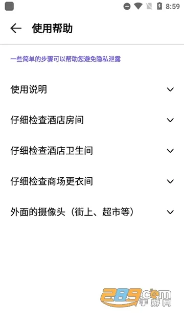 4. **功能多样**:不仅能检测摄像头,还提供防偷拍妙招、专业秘籍及指南等。时时检测,使用方便,为你提供全面的隐私安全保障,让偷拍设备无所遁形。