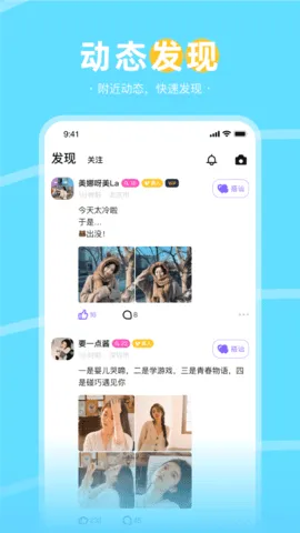 3、动态发现功能有趣,可分享自己点滴瞬间,展示生活状态,还能看到他人动态并互动。
