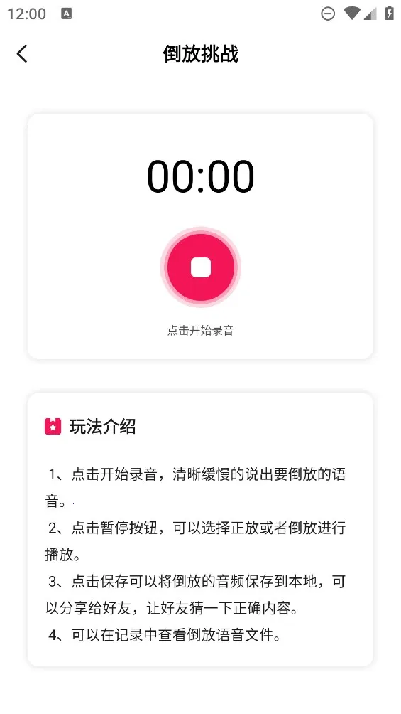 倒放挑战安卓版是一款音频编辑应用,融合创新与实用。有语音倒放、视频加速减速等功能,操作简单,支持自定义裁剪、音频混合等,还能录音播放,一键分享,为娱乐及专业制作提供便利。