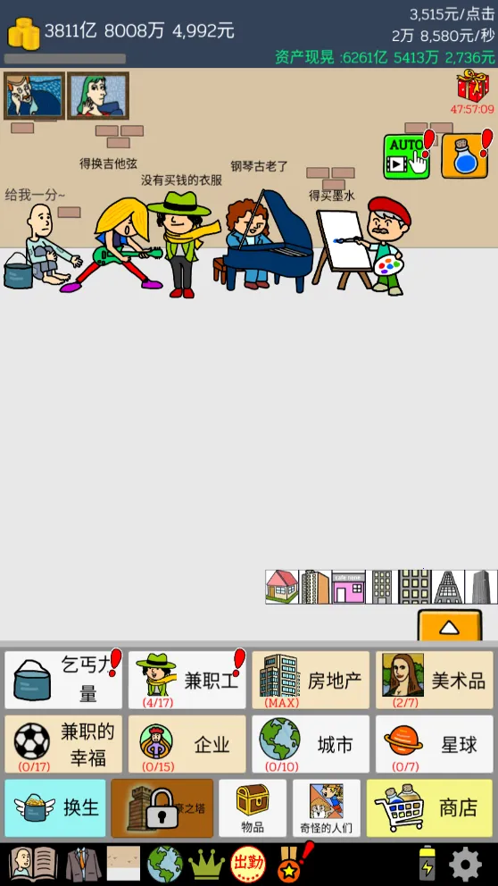 2、拥有丰富多样的玩法。玩家能体验独特故事剧情,从一无所有开始建立商业帝国,还能通过多种方式赚钱提升生活水平,如雇佣各种职业乞丐打工、购买房产和美术品等。