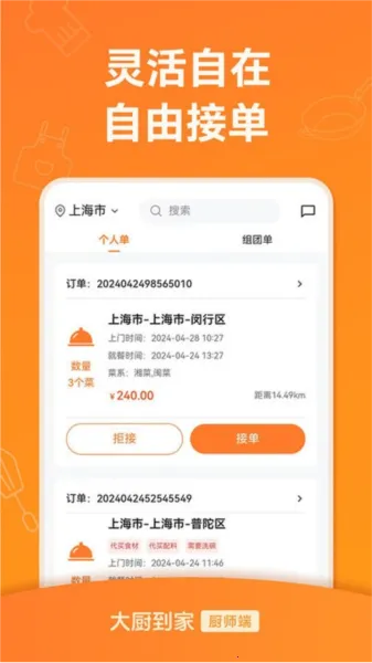 接单超灵活,厨师可根据自身时间安排,自由选择是否接单,轻松自在无束缚。