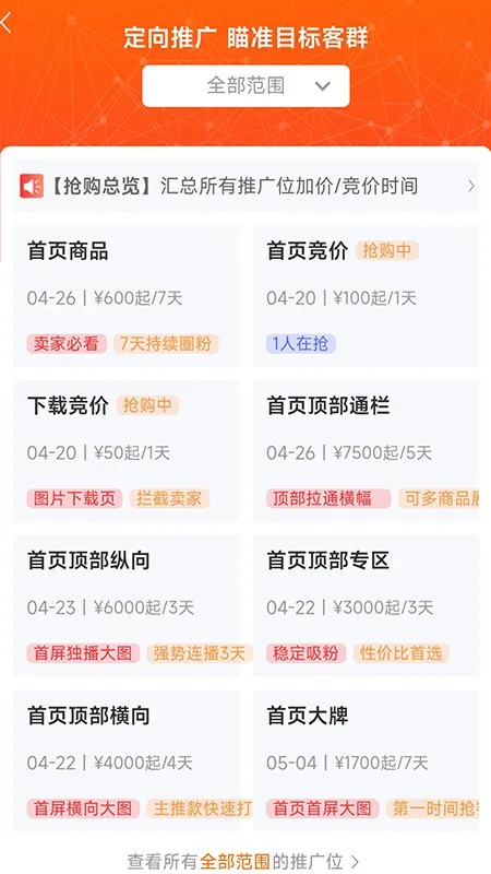 4. 营销工具丰富:提供多种广告位,可自行选择投放广告,有效提升商品曝光率。