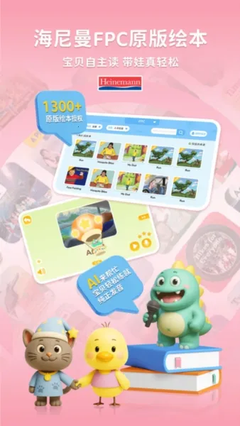 海尼曼FPC是一款超棒的英语学习平台。它有1300本美国原版绘本,通过科学分级阅读体系,助不同年龄段孩子掌握英语知识。这里有上千种英语故事文章,孩子能按分级找适合自己的内容阅读。它开发了亲子合作互动玩法,家长能陪孩子学英语,增进亲子关系。软件特色满满,专属阅读陪伴,老师实时一对一点评纠音;海量阅读资源,一键畅读;智能AI分析阅读水平,推送适合难度资源。软件亮点众多,可定制阅读计划、在线阅读绘本、加入书架、自动记录阅读数据、智能推送相关绘本、下载绘本离线阅读。软件功能丰富,包括每日推荐、学习统计、学习计划、故事阅读、口语练习、单词学习等。优势显著,分级学习、专属报告、灵活规划、智能纠正、趣味学习、标准音频。更新后还有入门定级测、智能口语训练等新功能,快来下载体验吧!
