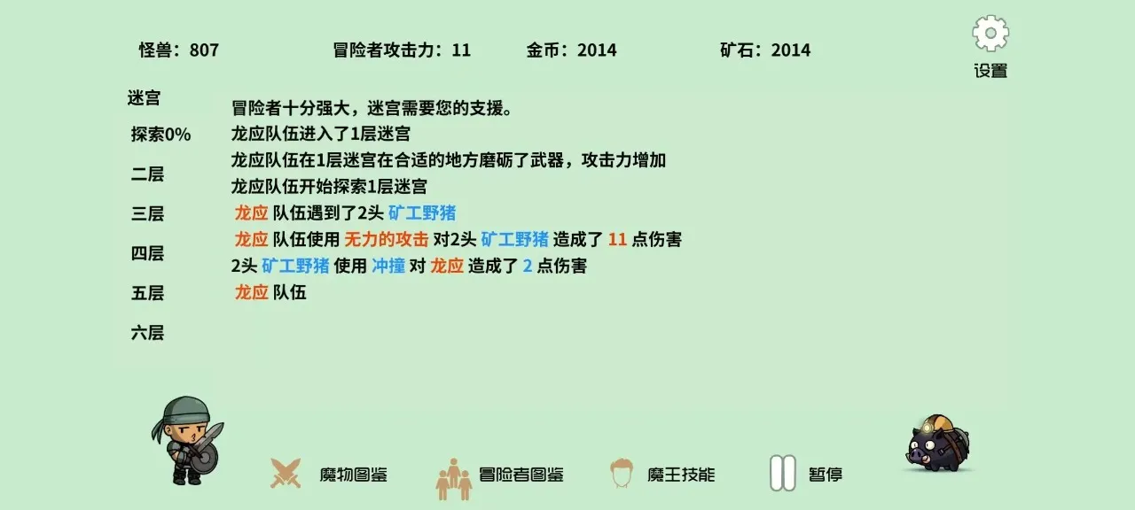 怪至安卓版是一款自动放置文字游戏,核心操作是点击魔王技能,否则冒险者会攻破迷宫。关卡丰富,玩法简单。释放技能伤害各异,要击败怪兽。还能为勇者换装,在冒险中提升能力,整体流程约二十分钟。