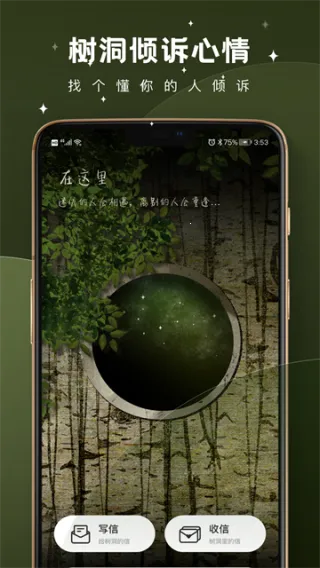 树洞倾述2026官方正版是安卓手机实用软件,压力大时能匿名倾诉。有匿名写信、双角色切换、日记记录功能。暗夜风界面,主题可换,无需社交关系,操作简单,助用户管理情绪、放松心情。
