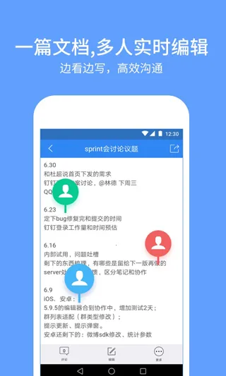 操作便捷:左侧栏为工作群列表,中间栏是文档目录及编辑器,右侧栏是讨论区,操作轻松,沟通专注。