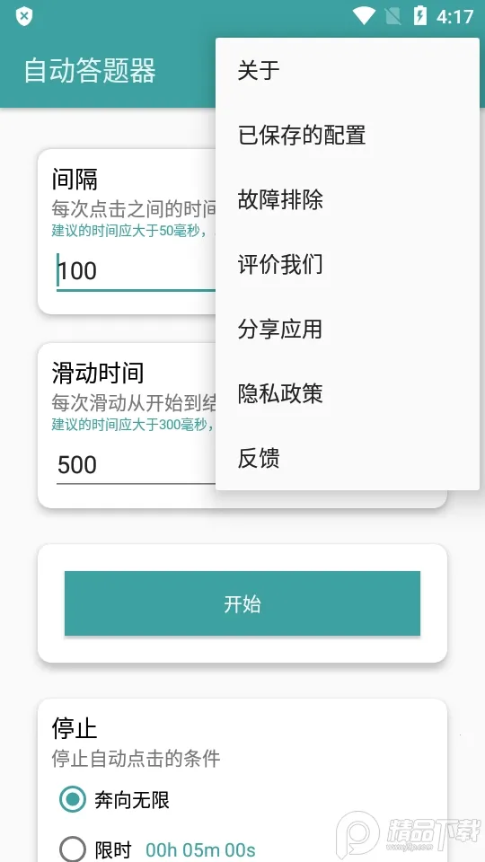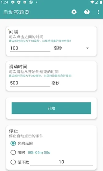 自动答题器是一款超实用的工具,能帮你轻松应对各种答题场景。使用它,你可以预先设置自动点击或滑动的屏幕位置,确定答题时的操作点。还能配置间隔时间、滑动时间以及停止条件,比如限时5分钟或循环10次,并且能保存当前配置备用。启动功能后,它就会按预设参数自动答题。