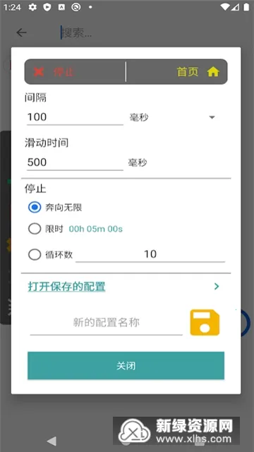 2.配置 “间隔时间”“滑动时间” 以及 “停止条件”(如限时 5 分钟或循环 10 次),也可保存当前配置备用