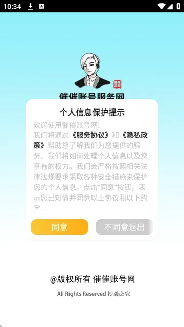 1、打开催催账号网app,点击同意隐私政策