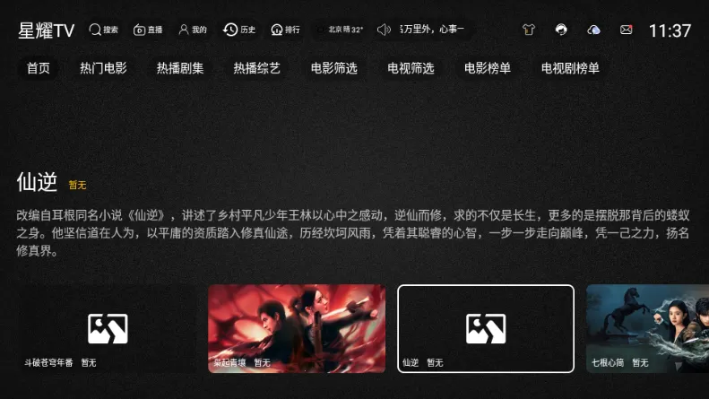 星耀TV电视盒子版是追剧好帮手!它内置丰富视频源,有多种线路可选,海量热门影视,电影、电视剧、动漫、综艺应有尽有,能满足多样观影需求。超清晰画质,多种播放模式和清晰度任你挑,带来极致视觉体验。还有强大智能搜索引擎,瞬间找到想看的视频,看剧无广告打扰。