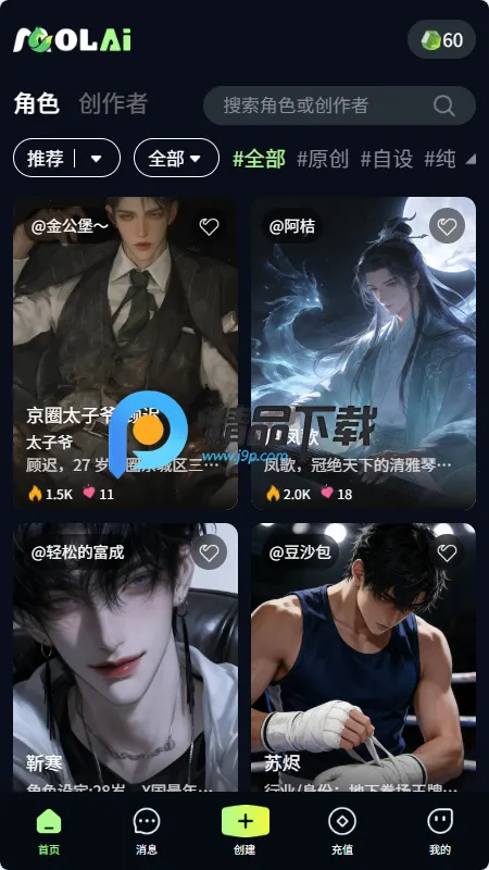 3. 角色类型超丰富:该应用涵盖丰富的女性向和男性向角色,包括原创自设和纯爱等类型,故事剧情涉及校园救赎群聊等多样主题,满足不同用户需求。