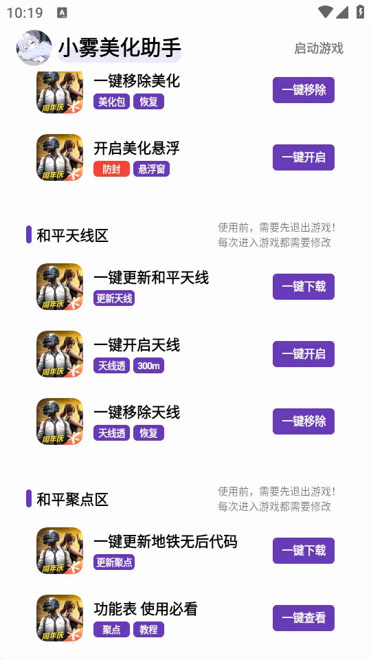 2. 操作便捷:一键开启美化,快速开启悬浮窗功能,一键更新游戏,轻松几步即可完成相关操作。