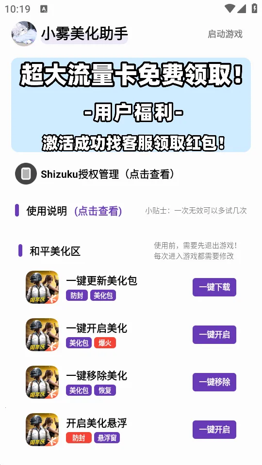 小雾美化助手是一款为和平精英吃鸡游戏打造的工具。它是最新版本,支持最新游戏安装包。能一键开启美化,快速开启悬浮窗功能,一键更新游戏,还有各种教程内容,是吃鸡玩家必备。使用时,先点击一键下载按钮下载文件,安卓十以上需Shizuku授权。进入游戏更新好后退出,再回到助手点击一键开启美化即可。开启美化时要防止启动游戏意外闪退,移除美化进入游戏到登录界面退出再开启美化重新进游戏。注意最近不要开启悬浮窗里的大厅防封。它能解决衣服美化配置不少于1000套、全枪皮美化等诸多问题,卡密码获取方式是打开软件选功能按提示做任务输入答案。整体来说,对吃鸡玩家有较大帮助,能满足多种美化需求。