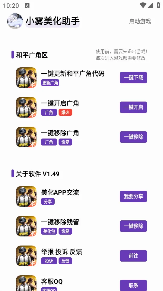 小雾美化助手是一款专门为和平精英吃鸡游戏打造的美化工具。它能让你轻松一键开启美化,快速开启悬浮窗功能,一键更新游戏,还有各种游戏代码等教程内容。使用它,你可以对游戏中的衣服、枪皮、配件、载具等进行全方位美化,解决游戏画面单一的问题,让游戏体验更丰富。