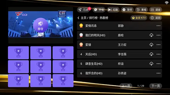 金音KTV点歌系统能满足你在KTV场景下的各种需求。它功能超丰富,海量曲库覆盖流行金曲、经典老歌、抖音热歌、外语歌曲等,每日更新热榜新歌,无论你喜欢哪种风格都能轻松找到。支持智能搜索,按歌名、歌手、语种、年代等分类检索,还有首字母拼音搜索和手写输入功能,点歌效率超高。部分版本还支持语音点歌,说出歌名就能快速播放。电视端安装软件后,可通过手机微信扫描二维码进入小程序远程点歌。而且在本页面下载的版本无需卡密和激活码,下载安装好即可免费使用,显示尊享会员。每首歌曲都有高质量音频文件,保证唱歌时能享受清晰高保真音乐效果。还能创建个人歌单,方便下次快速找到喜欢的歌曲。有了它,家庭聚会或朋友欢唱都能轻松管理点歌列表,保持娱乐连续性,让你尽情享受欢乐时光,快来下载吧!