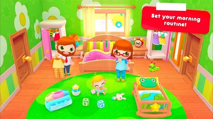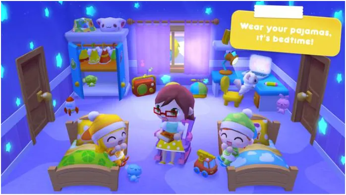 游戏玩法丰富多样。进入游戏后,可通过点击切换场景,利用太阳图标改变时间,拖动角色到场景中,在浴室帮小朋友洗澡,晚上让角色上床睡觉等。玩家能真切感受日常生活乐趣。
