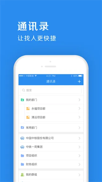 中铁e通是面向中铁的移动协同办公软件,将作业系统数据化网络化。有完善OA系统、通讯聊天功能,支持500人群聊。具备日程会议等特色,还有企业通讯录等优势,能提升凝聚力,方便办公沟通协作。