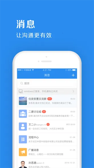中铁e通鸿蒙版是面向中铁的移动协同办公软件,将作业系统数据化网络化。有完善OA系统、通讯聊天功能,支持500人群聊。具备日程会议等特色,还有企业通讯录等优势,能提升凝聚力,方便办公沟通协作。