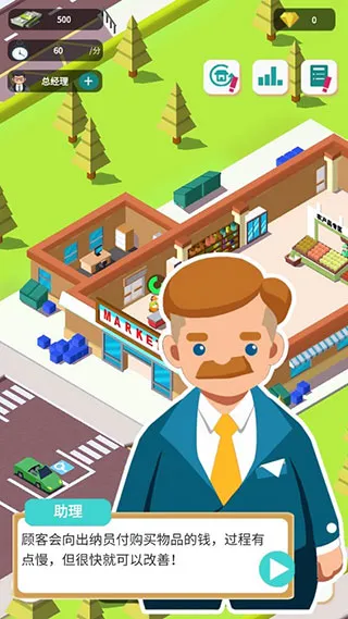 4. 策略管理:可制定重要管理决策,如升级专区、建设停车位、聘请员工、研究开发新功能等,发展超市业务,建立属于自己的超市帝国。