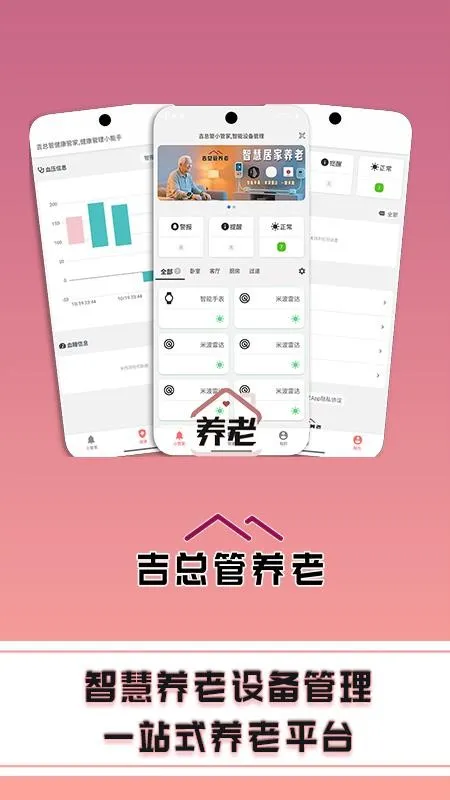 吉总管养老系统能帮您轻松解决养老生活难题。它提供设备管理功能,可实时管理各类设备,一键管理所需设备,还能分类查看,实现分类管理。设备异常时会发出警报提醒,方便您及时处理。您能一键呼叫绑定的智能养老设备,轻松便捷。此外,它提供线上居家养老服务,开启优质养老生活体验。还能实时监测您的健康信息数据,便捷管理自身健康。有了吉总管养老系统,您可以享受一站式智慧养老服务,体验多种智能养老设备,实时查看设备状态,直观明了地查看可视化健康数据。它让养老生活更轻松、便捷、智能,有效解决了老年人养老生活中的诸多难题,是您养老的好帮手,快来体验吧!