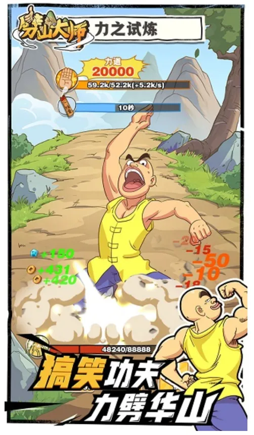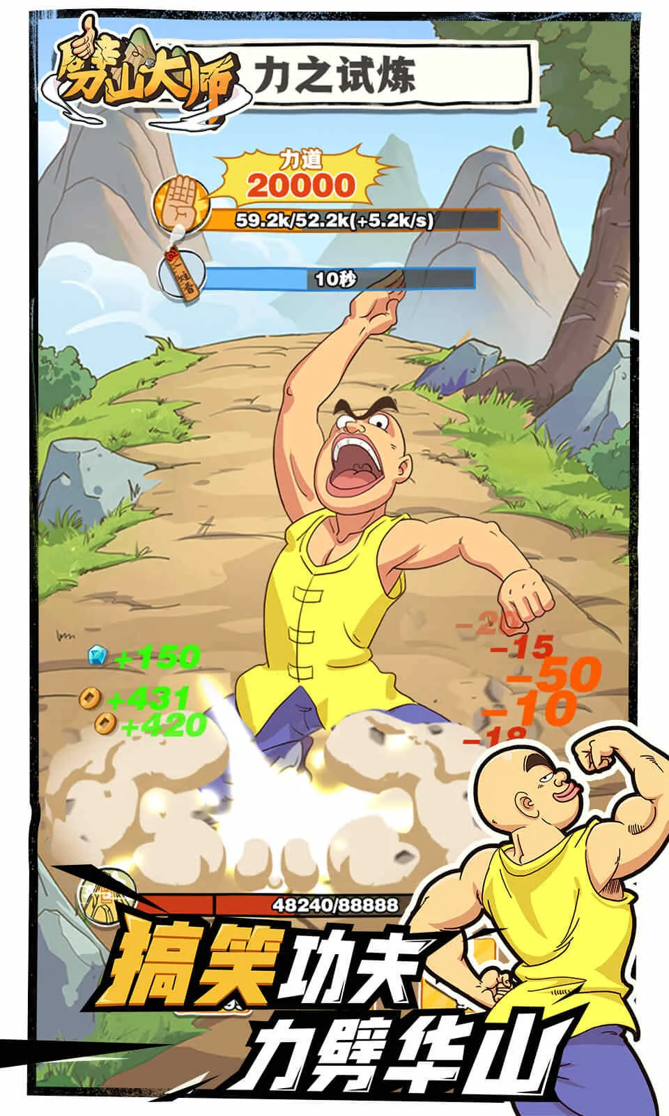 1、扮演功夫大师:你将化身为功夫大师,摧毁各种神奇道具,锻炼身体各部位,向着劈开华山的目标迈进,体验独特的功夫修炼之旅。