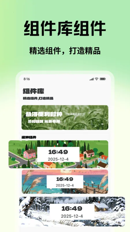 2、样式丰富:能为钟表更改更多样式,让闹钟小组件变得更加好看,组件库展示各种不同风格组件,可自由选择。