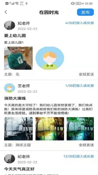 丰富动态发布:可挑选相册照片添加到成长相册并编辑文字后发布幼儿园动态,还能发布公告让家长了解情况。