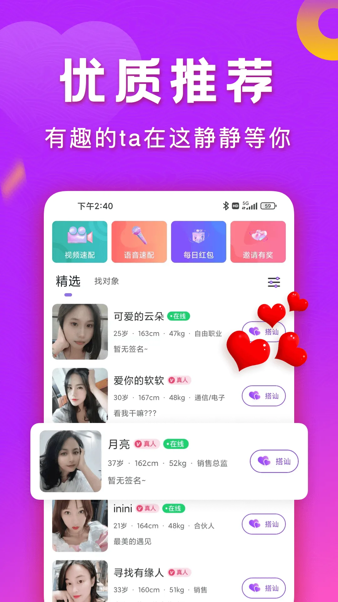 2. 互动轻松告别尴尬:平台上都是经过严格认证的用户,颜值高且互动聊天不尴尬,轻松找到合拍对象。