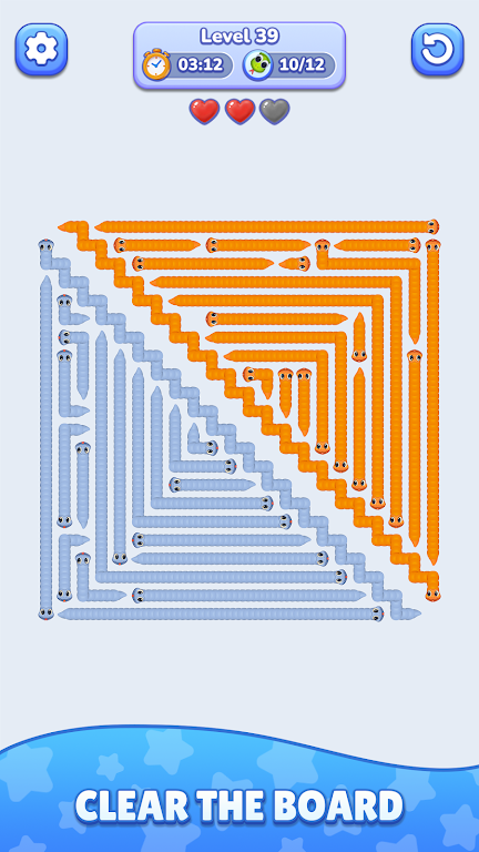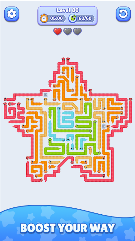 蛇摆大师是一款令人着迷的游戏。其玩法简单易懂,适合各年龄段玩家。通过点击屏幕控制蛇在迷宫中移动,每个关卡都有明确目标,要在规定时间内完成挑战,策略和反应能力至关重要。迷宫设计独特,布局和障碍多样,难度随关卡深入增加,不断考验玩家思维和决策速度。时间限制带来刺激紧张感,心脏系统让挑战更多样有趣,提升专注度和游戏体验。画面干净简洁,蛇形象生动,动画流畅,沉浸感十足。它既能满足休闲需求,又能挑战智力,玩家可不断提升技巧追求更高成就,是益智游戏爱好者不容错过的佳作,能带来充满策略、速度和思考的冒险之旅。