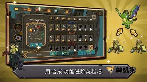 2、装备合成,提升武器的威力。同类英雄合成可以成长为更强大的角色职业。