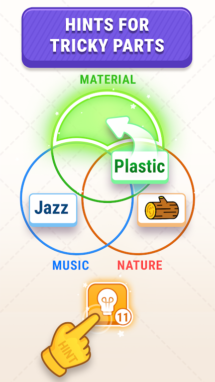 多样化谜题设计:谜题有挑战性且形式多样,有多个环重叠区域和意想不到的类别组合,考验创新思维与反应能力,能满足不同玩家需求,激发智能潜力。