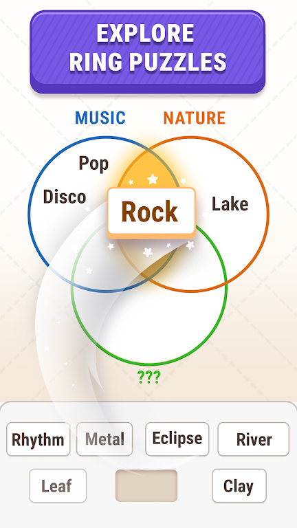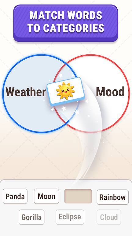 独特游戏机制:核心玩法别具一格,单词被赋予特殊意义,玩家拖动单词到恰当环中,需运用逻辑推理与直觉识别词汇联系,强调词汇层次与关联,非单一字面意义。