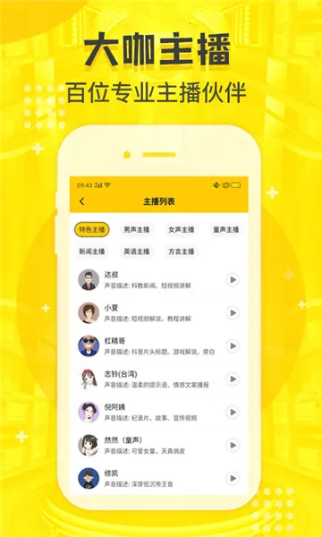 主播众多:配音鸭拥有近六百位智能主播,涵盖男生女生童声方言外语等多种音色,满足不同配音场景需求。