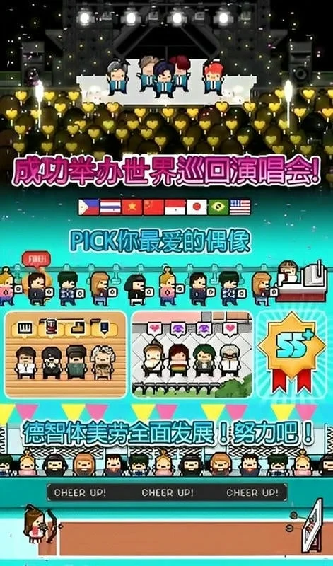 开罗偶像天团养成记是一款超有趣的模拟经营养成游戏。在这里,你能从零开始组建偶像团体,给成员安排训练、处理黑粉和绯闻,操心他们的身体状况。等爱豆实力提升,就能做专辑、开演唱会啦。