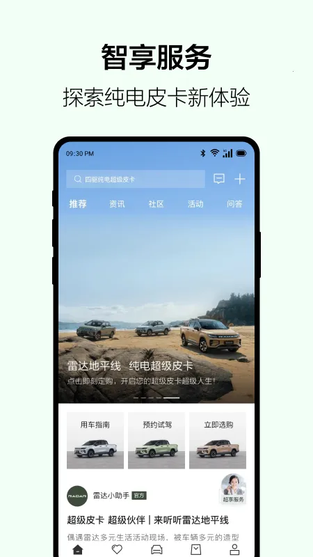 个性化定制购车服务,可根据个人喜好和需求,定制专属的雷达汽车,并享受一键预约试驾的便捷。