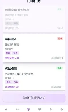 3. 可接取门派任务,如传递密信、潜入敌营、救治伤员等,派遣对应能力弟子完成任务,积累声望壮大势力。