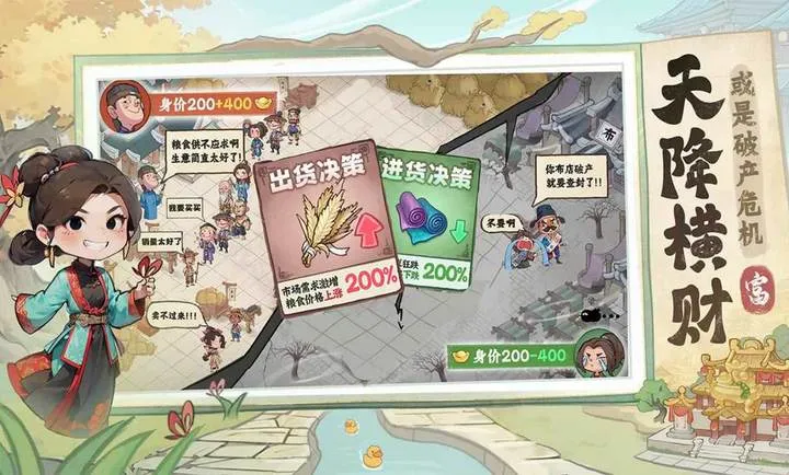 4. 丰富经营玩法:将现代直播带货搬进古代市井,店铺有互动设计,升级店铺招募伙计自动化赚钱,轻松放置财源广进。