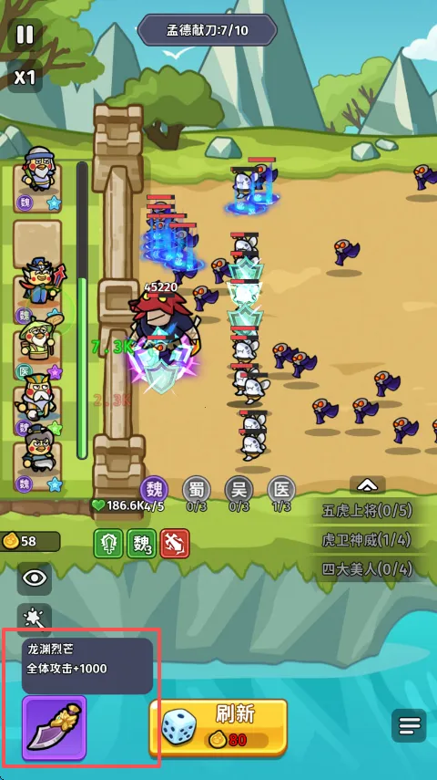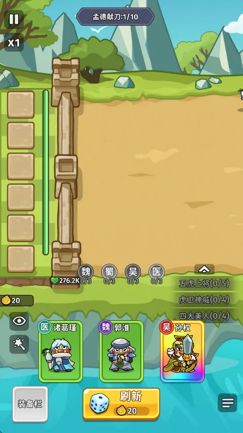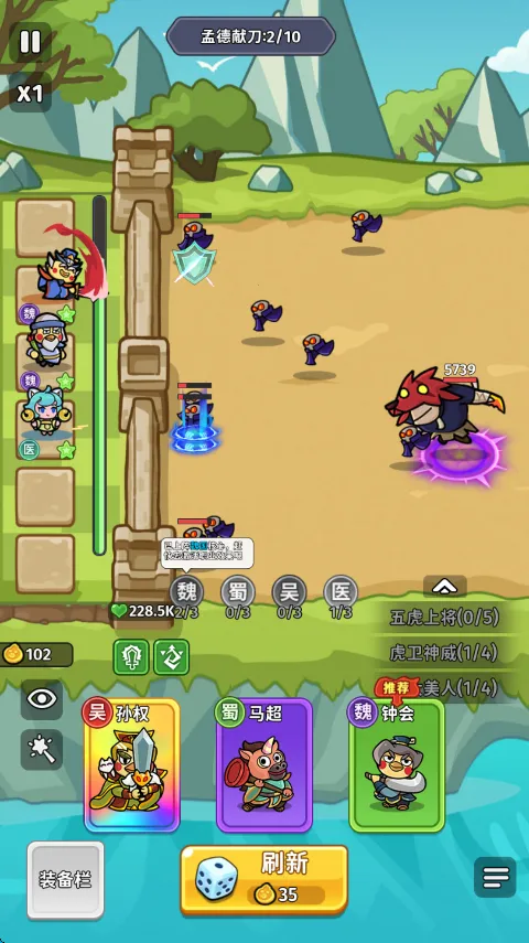 3. 多样玩法:采用抽卡塔防模式,玩家需抽取武将卡牌来抵御一波波敌人,内设丰富的羁绊效果,例如集齐刘备麾下的关赵张马黄即可激活五虎上将羁绊,大幅提升队伍战斗力。