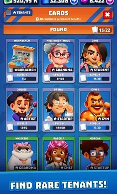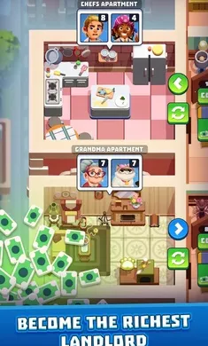 招揽租户提升租金,招募独特租户,升级租户卡牌提升租金收入、解锁自动化功能、提高公寓价值。