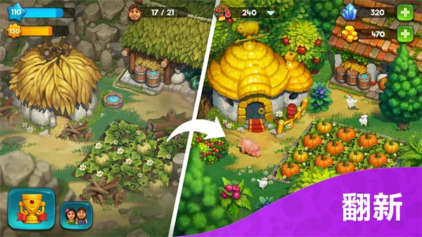 玩家可亲手打造专属家园,从一片荒地逐步建成繁荣小镇,修建各类高级建筑,如车间、学校、剧院等,见证部落一步步走向富强。