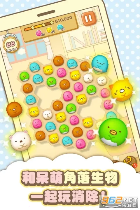 想找一款超有趣的休闲消除游戏吗?那一定要试试角落萌宠农场!它是San-X人气角色懒懒熊原班人马的最新创作,那些新出炉的可爱角色让人爱不释手。游戏采用独特的六边形四消玩法,四个同色方块连起来就能消除,消除同色越多还能进化成新的特殊方块。这里有很多可爱萌趣的卡通角色,像白熊、炸猪排、猫等。你不仅能享受消除的乐趣,还得照顾宠物、打理农场,超丰富的玩法绝对能打发无聊时间。而且它不限时间,用移动次数限制,还有贴心提示。游戏目标多样,比如消除特定颜色方块、让特殊方块掉落、消除特定位置草丛等,甚至会出现大型BOSS。游戏里的主角们各自有技能,消除方块能积累能量,技能还能进化,后面还能收集他们的时装和故事照片,时不时还有新活动更新,快来体验吧!