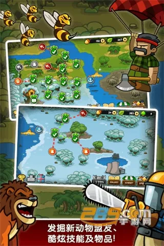多样动物角色:拥有20可收集可升级的非凡动物角色,如暴击型猩猩、治疗型熊猫、范围眩晕香蕉精等,每位角色均配备专属技能树与进化分支。