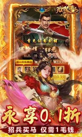 1. 全场充值永久0.1折,648充值仅需6.48元,首充低至1毛,升级再送5万元真实充值,返利丰厚,元宝、VIP经验轻松获取,0氪也能直上至尊VIP。