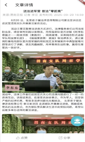 君子健法务APP基于军人军属法律服务站平台开发,推行互联网+拥军服务。涵盖多领域法律服务与政策宣传,打破传统壁垒,为军人军属等提供精准服务,助其了解法律、维护权益、提升素养。