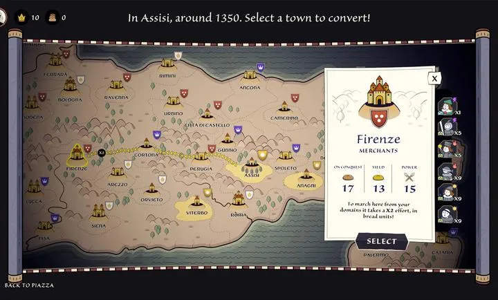 能选择自己的教义,在意大利各地布道,集结追随者,传播信仰,影响城邦,努力成为受人敬仰的圣人,开启充满变数的信仰之路。