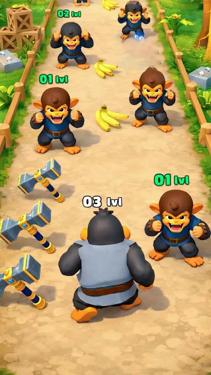 猿猴进化是一款刺激的跑酷游戏,玩家操控小猿猴左右滑动避障,吃掉等级低的猿猴成长,拾取锤子等道具破障,避开更强猿猴,冲过终点进化成大猩猩,有无尽跑酷玩法等特色。