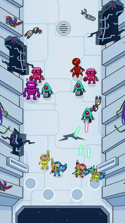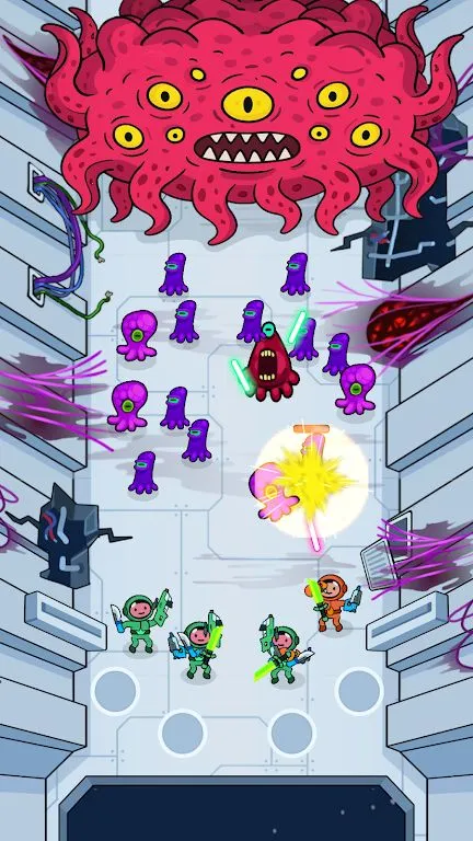 1. 独特战斗设定:指挥宇航员队伍,在零重力环境下作战,拾取武器,避开障碍物并收集奖励,对战外星人、机器人、掠食性植物和太空怪兽等。
