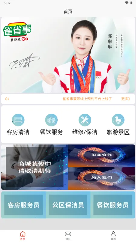 雀省事 2026 官方最新版本是专注服务外包与灵活用工的综合性平台,面向酒店景区等商户,提供客房清洁等岗位线上预约派单,为灵活就业人员打造便捷接单结算通道,含注册登录及做兼职指引,还有一站式服务。