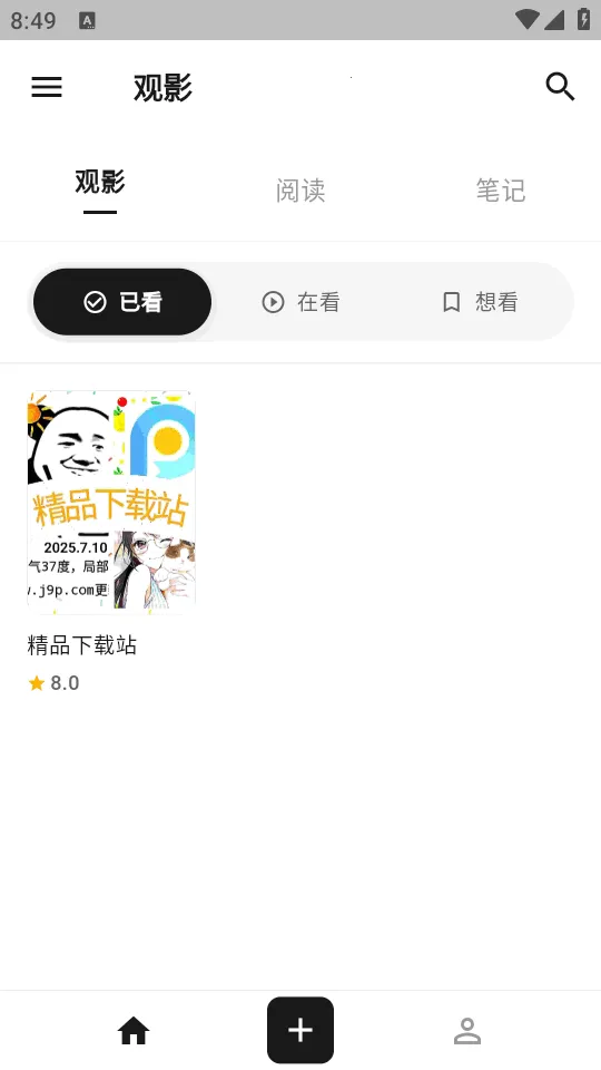 2、点击底部中间的"+"按钮,选择要添加的类型:观影、阅读或笔记,填写相关信息后保存。